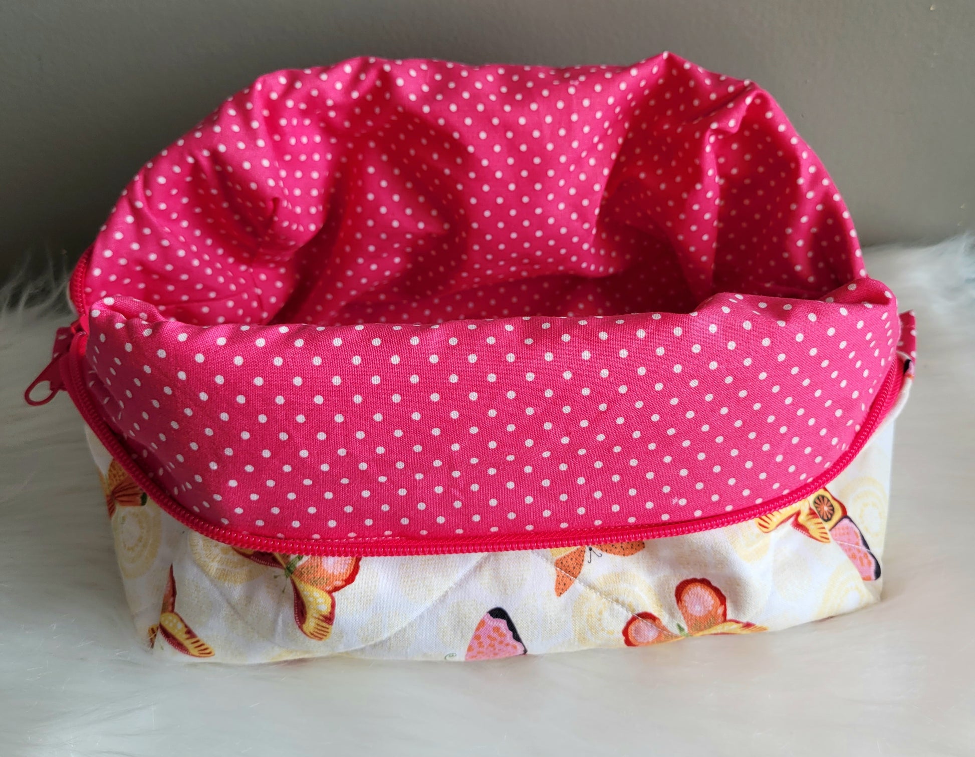 Organize your beauty essentials in style with this charming Butterfly Makeup Bag. Featuring a delicate butterfly design on the exterior, it opens to reveal a cheerful pink interior adorned with white polka dots. Perfect for storing makeup, brushes, and toiletries while traveling or at home. The compact size fits easily into purses and luggage, making it an ideal companion for on-the-go touch-ups. A playful and practical addition to any beauty routine.